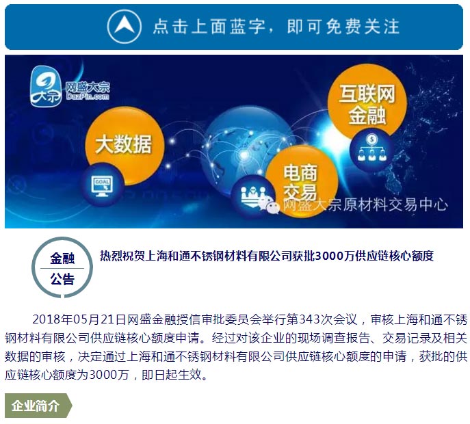 熱烈祝賀上海和通不銹鋼材料有限公司獲批3000萬(wàn)供應(yīng)鏈核心額度